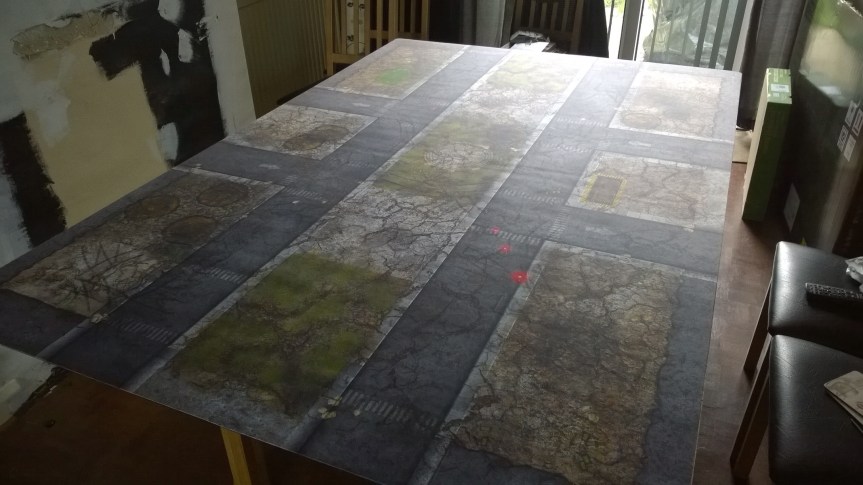 In order to save my friend constantly bringing over his three pieces of 3′ x 4′ wood to my house whenever we play a game, I decided to build my own gaming board.