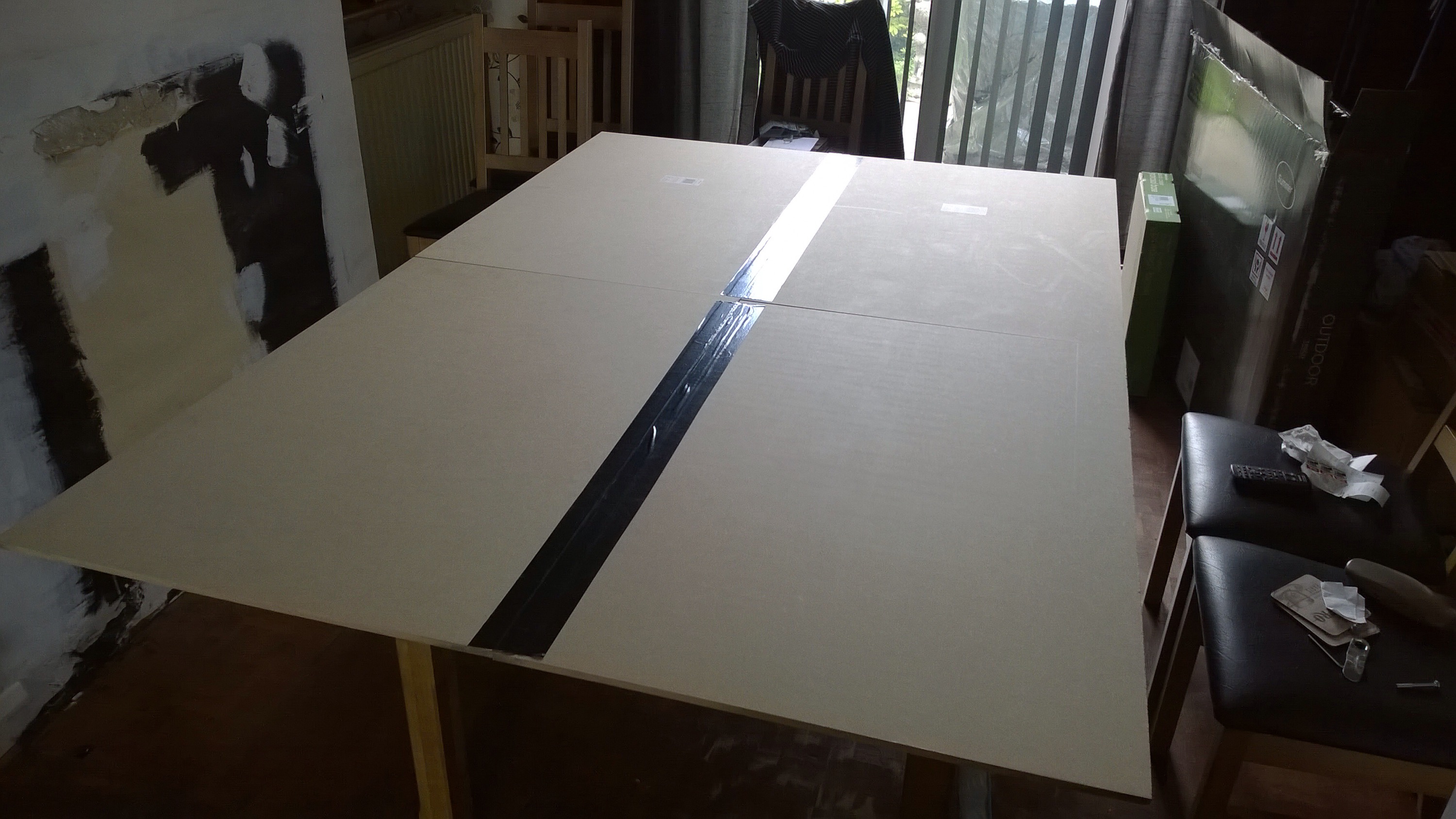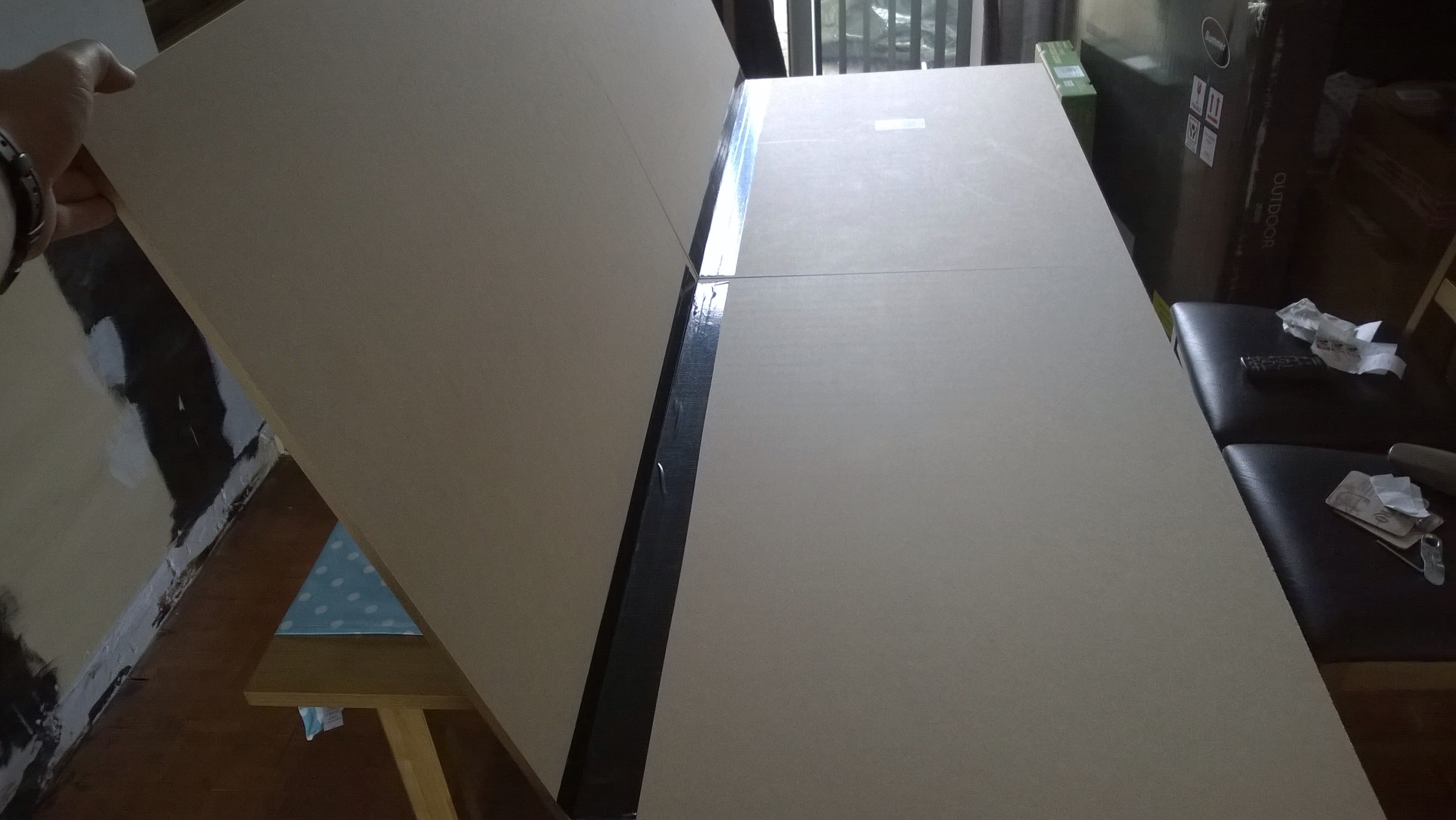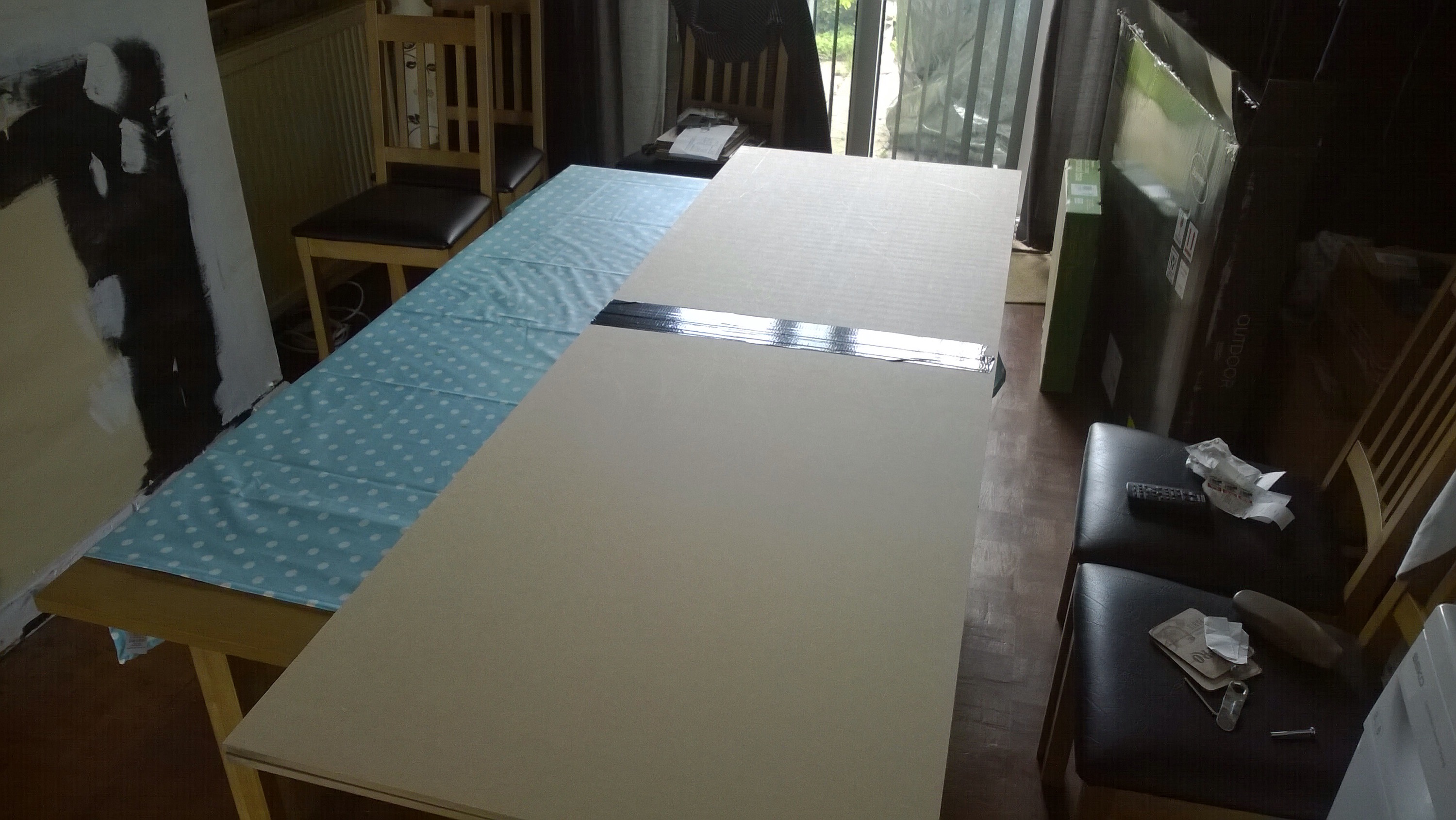 I bought 2 pieces of 6′ x 2′ MDF board and got the store to cut them in two (not exactly down the middle – grumble) and then stuck them together by making hinges with a healthy amount of Duck Tape.