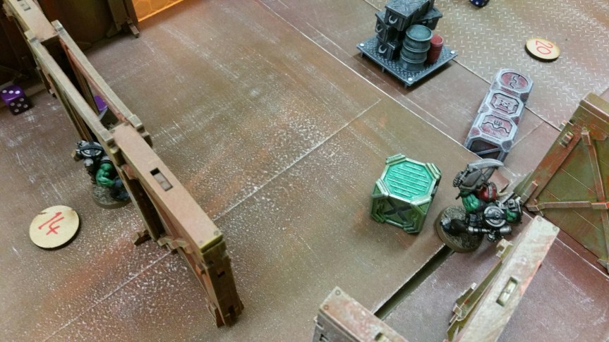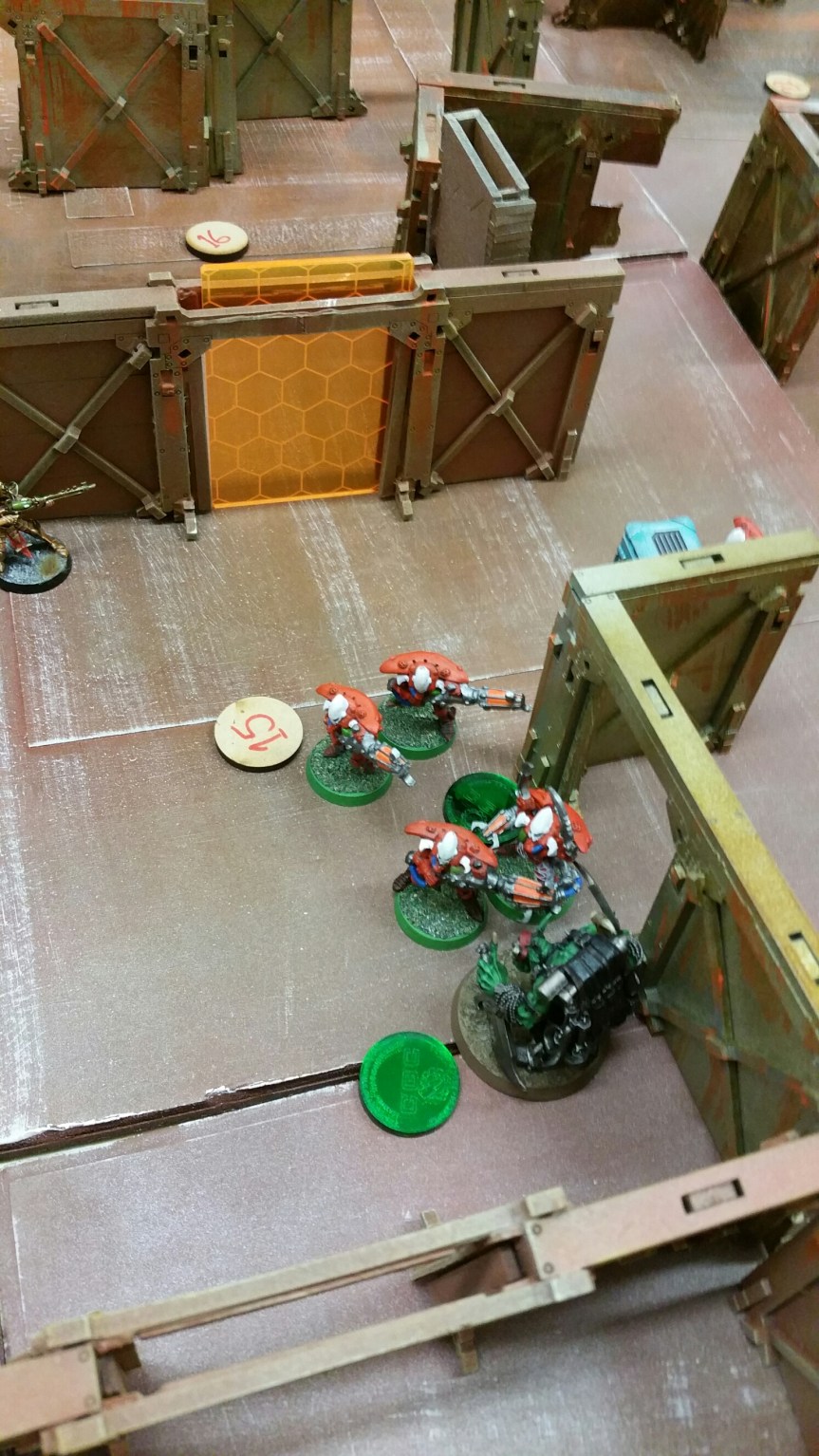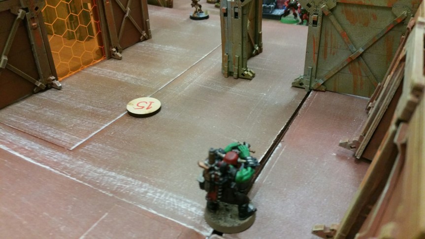 Team Green is close to getting to a teleporter but the roof falls in, crushing the last Ork Kommando (damn you Squares of Dispair! )