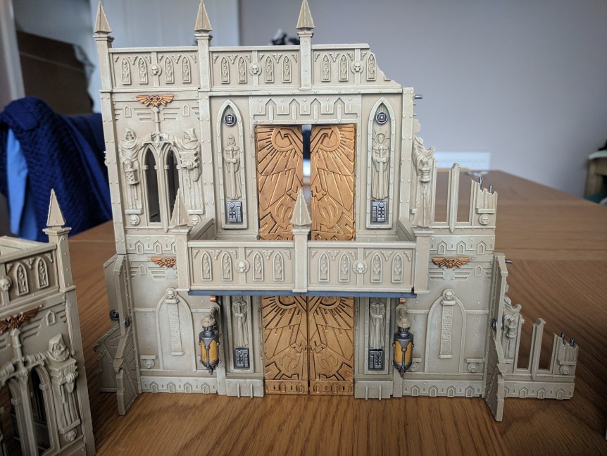 The bigger of these three buildings is actually a repaint, although I never finished the original paint job. I decided to paint all of my older city scenery (including ones I had already put a few colours on) in the same way that I plan to paint the new scenery kit that came in the Kill Team box set.