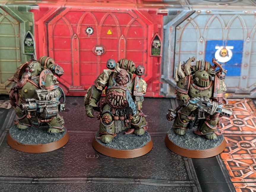 With the Death Guard, I decided to keep them their standard green colour. The pox walkers I painted as normal flesh colours but then used various shades to make them look bruised or raw skinned.