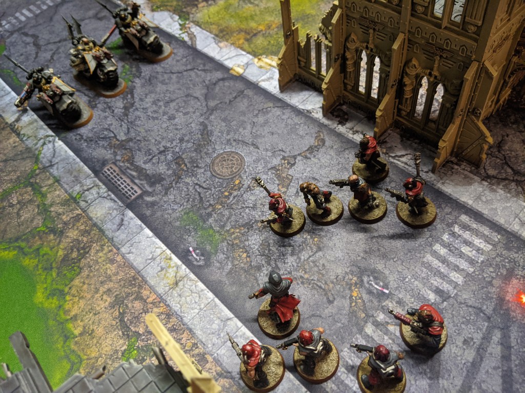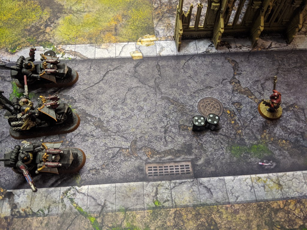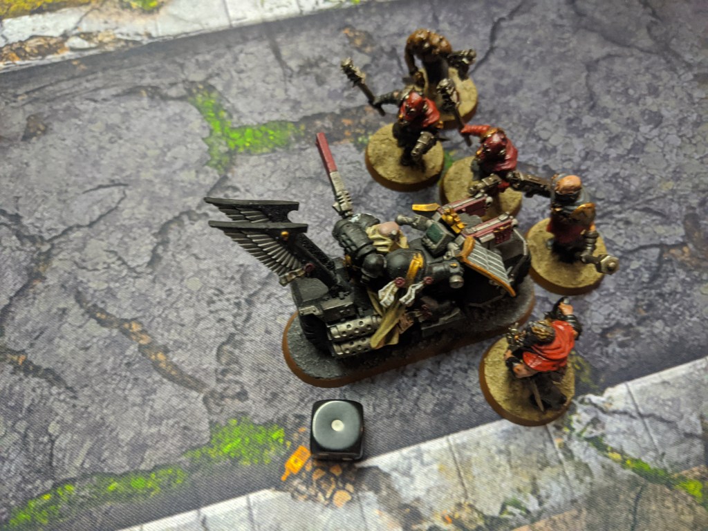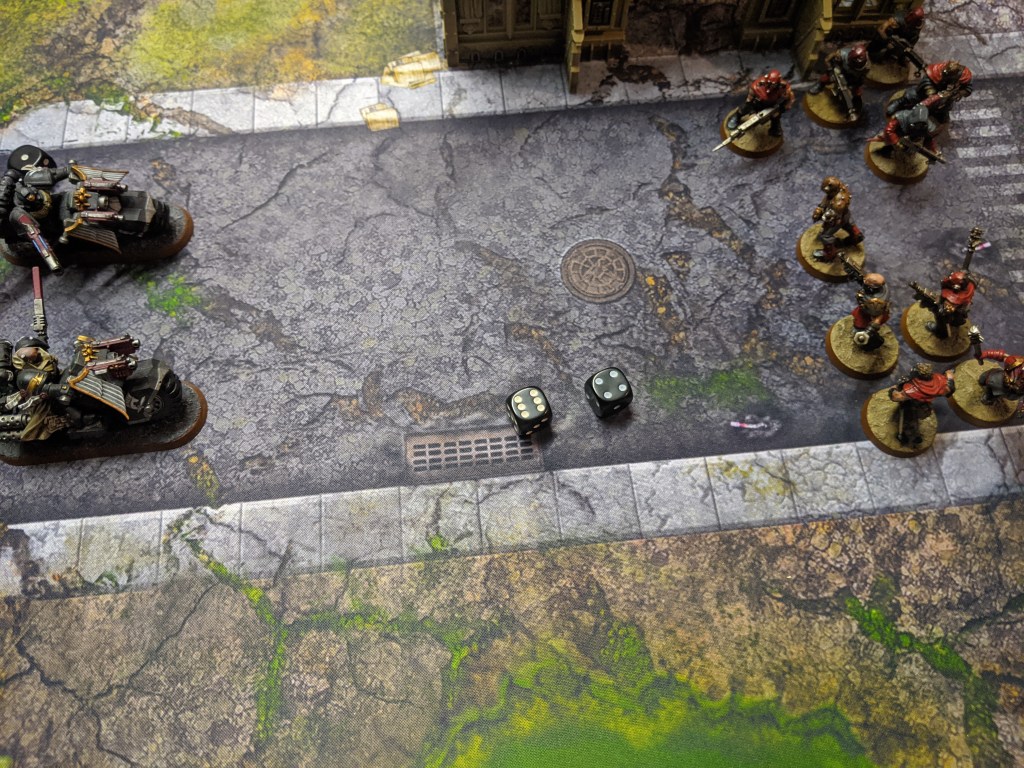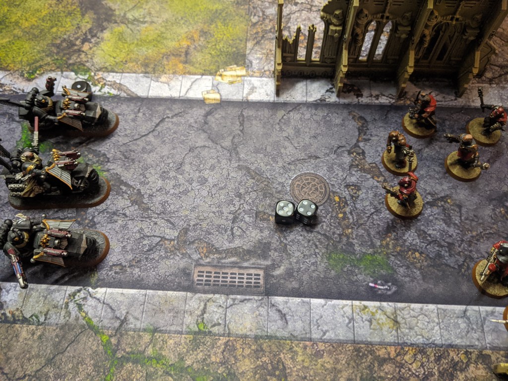 But they are almost entirely wiped out due to overwatch fire. One cultist survives and with the blessings of The Dark Gods, manages to inflict another wound onto the bikers, bringing down one of their number.