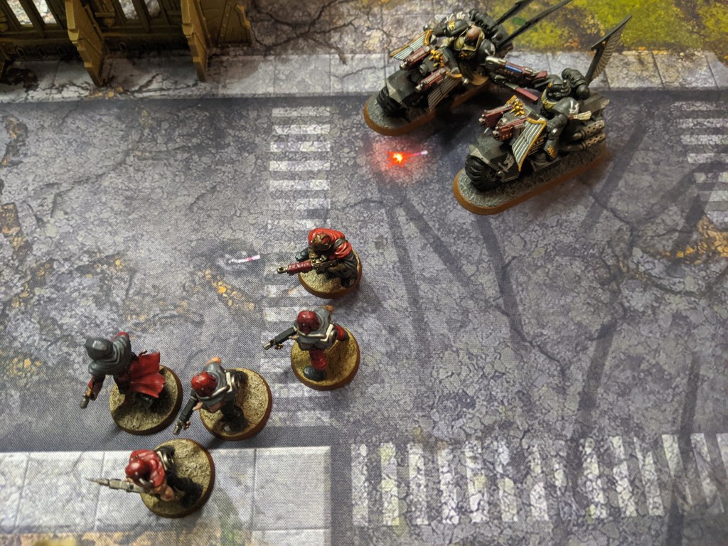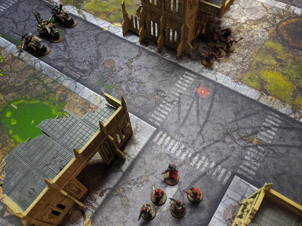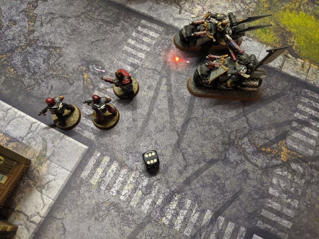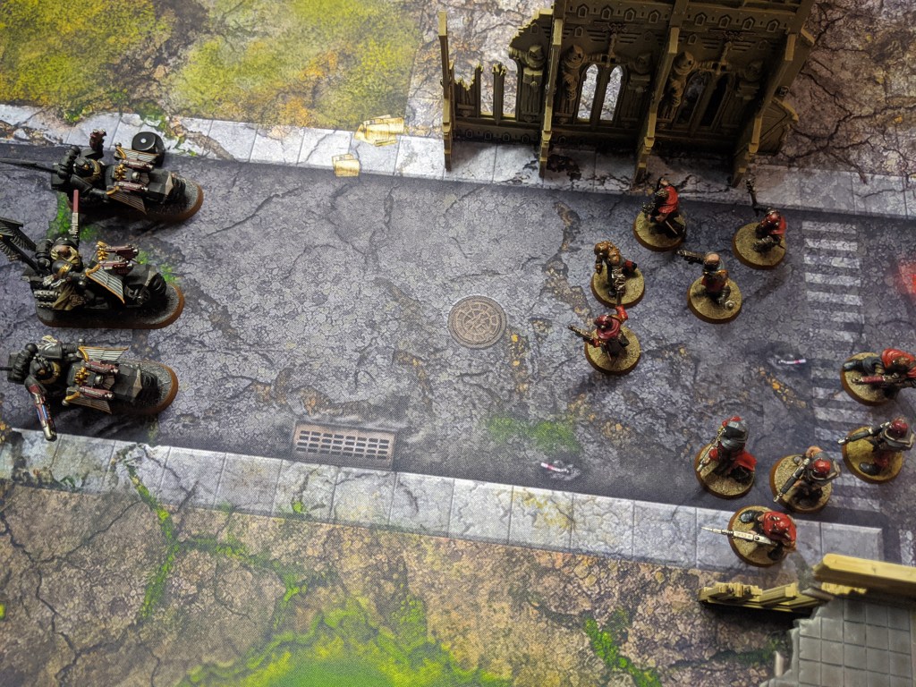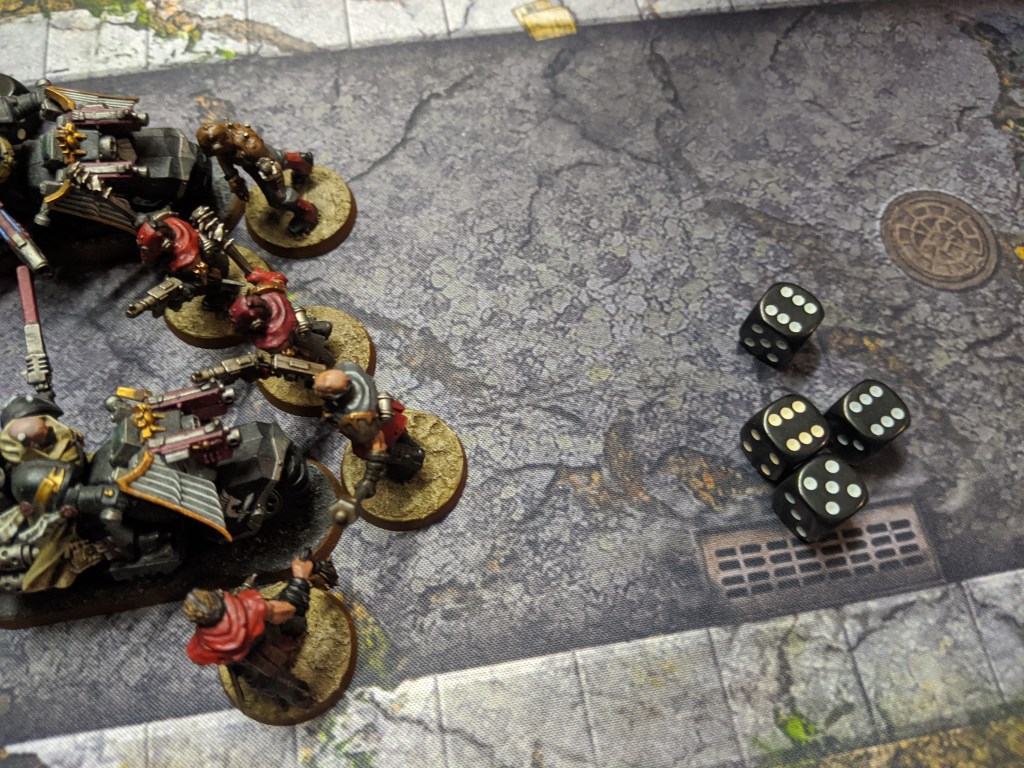 But they are almost entirely wiped out due to overwatch fire. One cultist survives and with the blessings of The Dark Gods, manages to inflict another wound onto the bikers, bringing down one of their number.