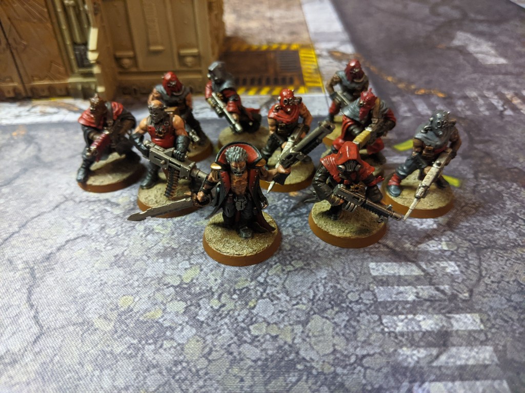 For engagements 1 & 2, the Chaos Cultists consists of two squads. One squad contains five cultists with autopistols and brutal assault weapons. One squad contains five cultists with autoguns.