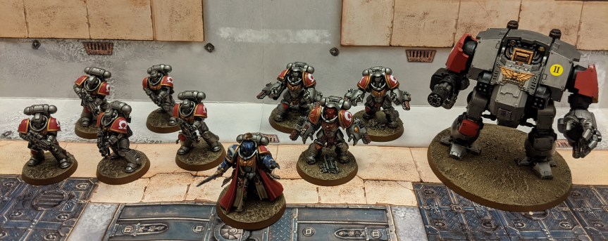 You’ll notice that this squad isn’t legal due to the double auxiliary grenade launchers, but these models are actually being used to finish off two Intercessor squads.