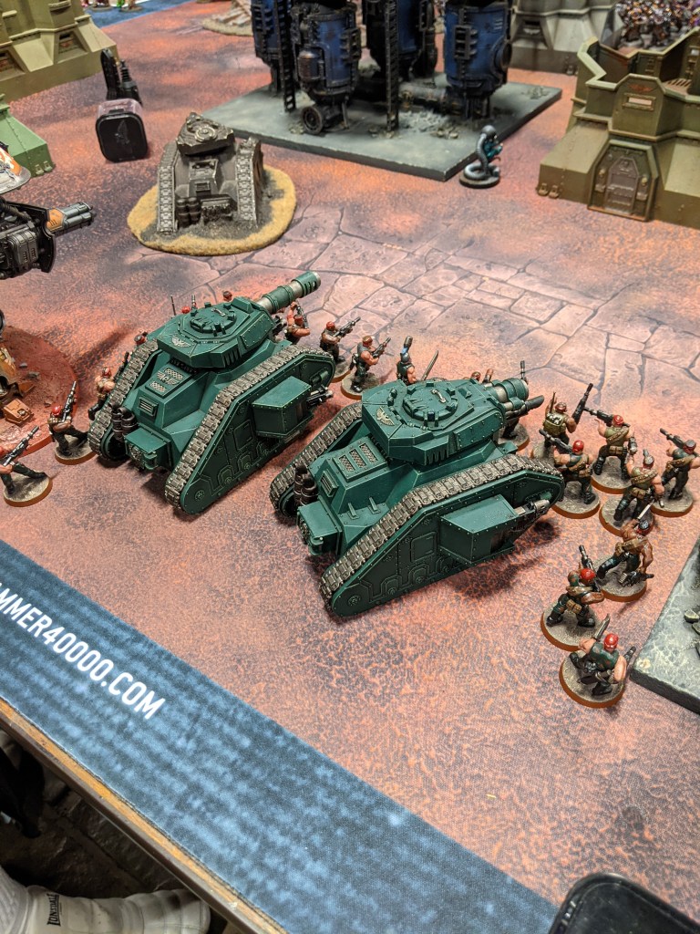 Unfortunately, I didn’t have 1000 points of Jungle Fighters, and what I did have was lacking in the tank department, so what better time then to get a couple of Leman Russ tanks painted up! Oh, and an extra Armoured Sentinel.