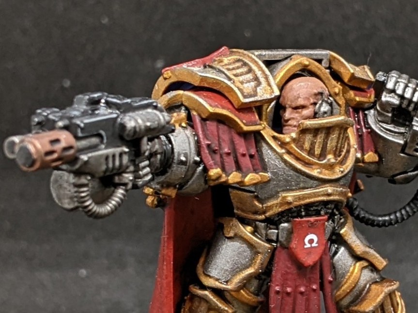 In battle, Nell wears a suit of ancient Cataphractii armour that dates back to the Great Crusade. This blessed Terminator armour has been worn by every chapter master since the Omega Guardians’ creation. It is therefore a Chapter Relic that the Omega Guardians will fight to the last in order to recover. The terminator armour incorporates a chainfist known as the Omega blade, which has ended countless traitors and heretics.