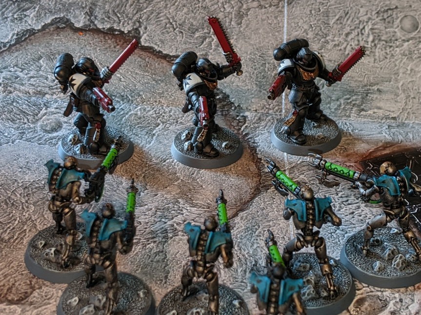 I’ve got some more Necrons and Space Marines to paint and for the Space Marines at least, I’m aiming to keep them in units of 3 and will paint them up as a few different chapters. This way it’ll be easier for students to play as different teams against each other.