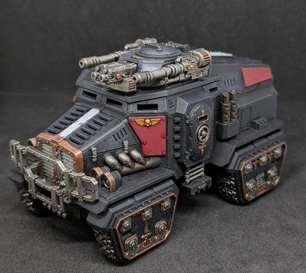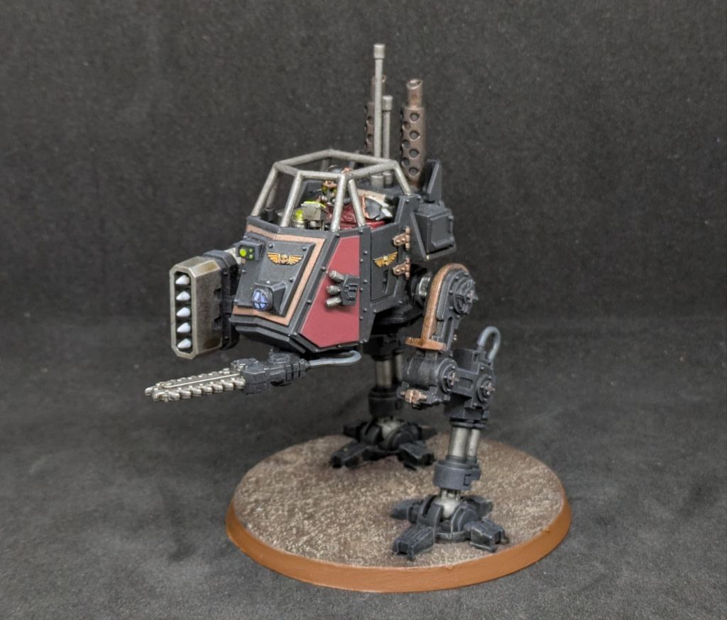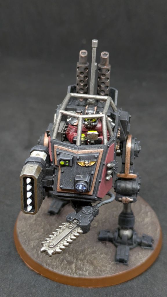 All this needed was to match the colour scheme and then using a driver’s head and shoulder pads from the Taurox kit, I was able to make this a Tempestus Scion Sentinel.